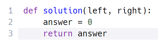 left와right가 매개변수로 주어집니다.left부터right까지의 모든 수들 중에서, 약수의 개수가 짝수인 수는 더하고, 약수의 개수가 홀수인 수는 뺀 수를 return 하도록 solution 함수를 완성해주세요.