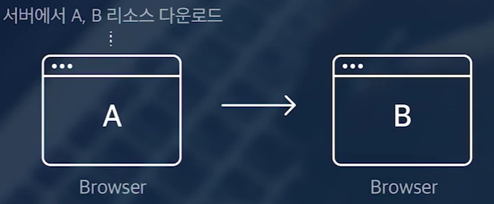 - 서버는 A와 B 리소스를 미리 다운로드한 후, 클라이언트(브라우저)에서 JavaScript를 통해 동적으로 HTML을 생성하여 화면을 구성하고, SPA(Single Page Application)에서는 HTML, CSS, JavaScript 등 모든 정보가 내장되어 있어 새로운 데이터만 불러와 화면을 업데이트하며, A 브라우저에서 B 브라우저로 이동할 때는 B 리소스를 다시 다운로드할 필요가 없습니다.