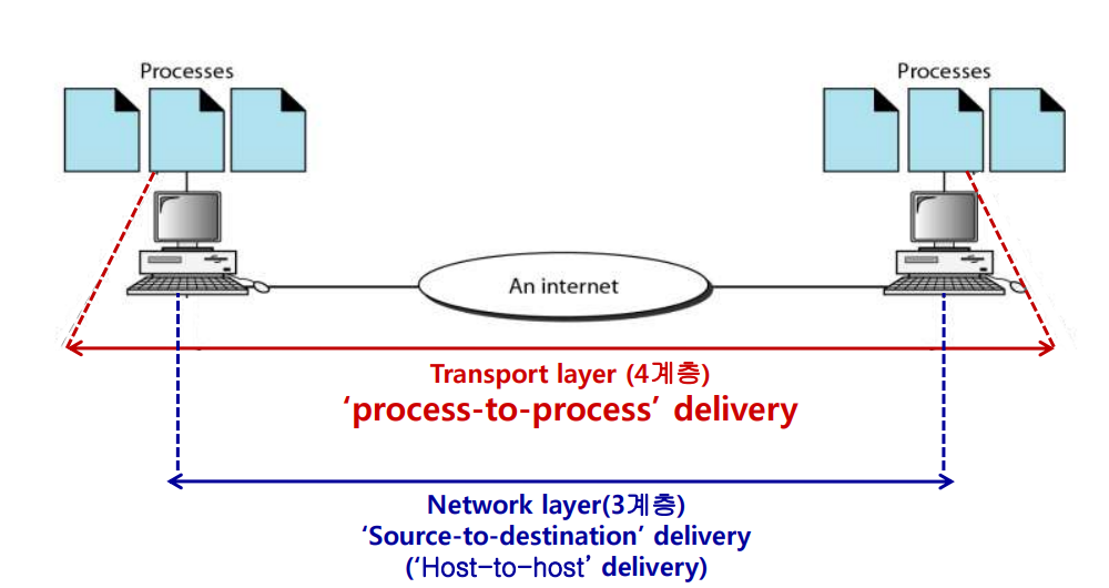 네트워크층과의 차이점: 네트워크 층은 컴퓨터에서 컴퓨터 사이의 관계라면, 전송층은 컴퓨터 내의 프로세스와 프로세스 사이의 관계라고 생각할 것