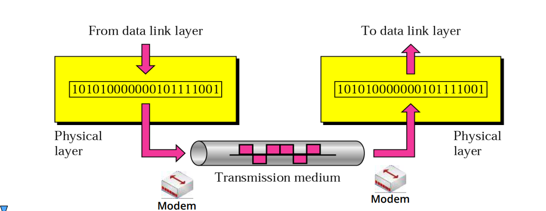 - 물리적인 매체를 통해 비트 스트림을 신호로 전달하는 책임