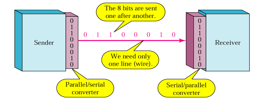 - 정보를 구성하는 각 비트들이 하나의 전송매체를 통해 한 비트씩 순서적으로 전송되는 형태