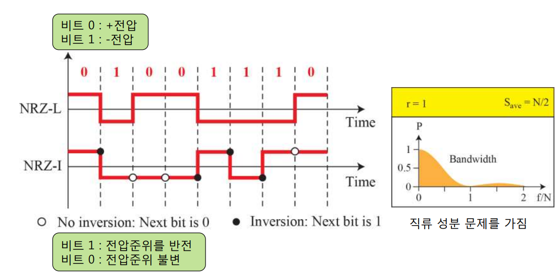 2) NRZ-I (NonReturn to Zero, Invert): 전압에 변화가 있거나 없는 것으로 비트값 결정