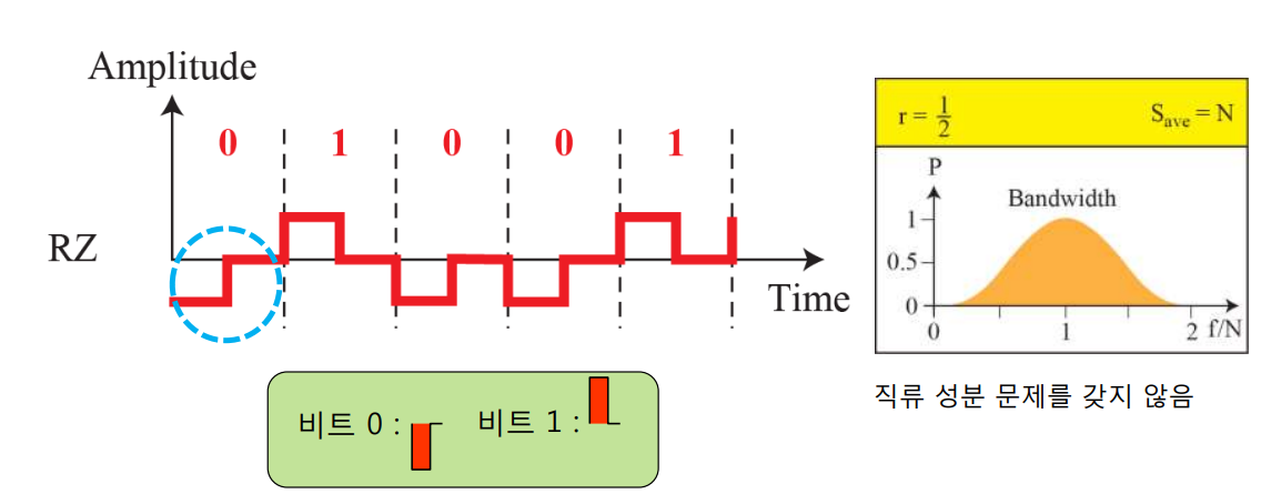 - 신호는 비트와 비트 사이에서 바뀌는 것이 아니라, 매 비트 구간동안에 바뀐다. 비트 간격의 반이 지나고 나면 신호는 0으로 바뀐다. 극성이 갑자기 바뀌면 여전히 문제는 생기지만, 직류 성분 문제는 없다.