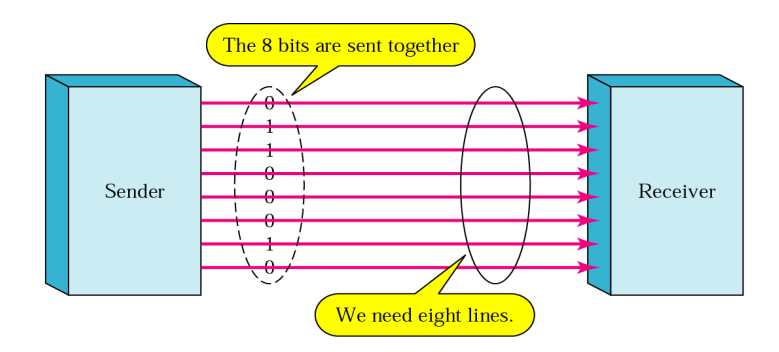 - 정보를 구성하는 각 비트들이 여러 개의 전송매체를 통해 동시에 전송되는 형태로, n개의 채널이 필요하다.