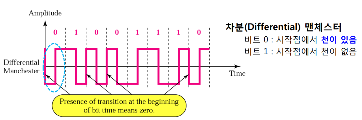- 한 비트를 부호화하기 위해 두 번의 신호 변화를 필요로 하는데, 이는 더 큰 대역폭을 필요로 하기에 오늘날에는 사용되지 않는다.