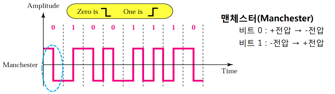 1) 맨체스터 부호화: 동기화를 달성하는 동시에 해당 비트를 표현하기 위해 비트 중간에서 신호 전이.