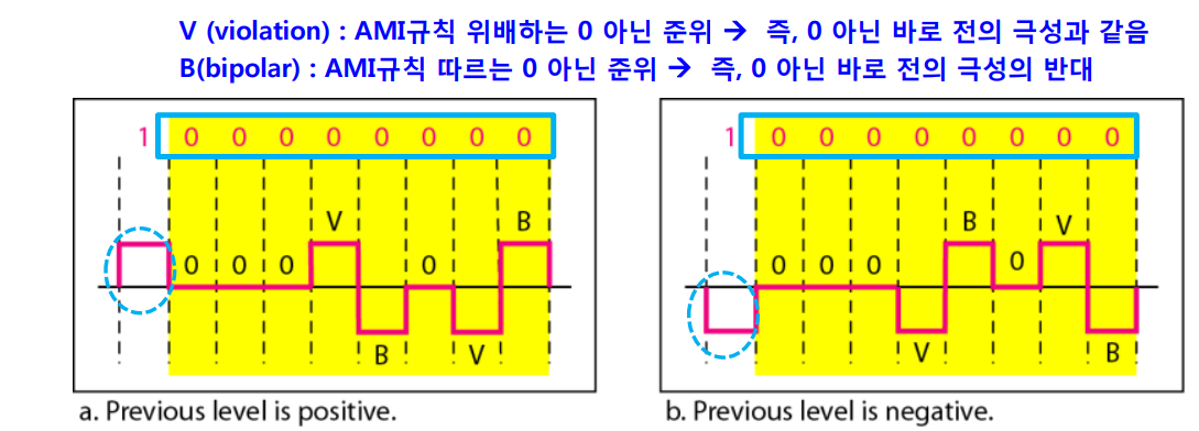 연속된 1의 경우에는, 음과 양이 교대로 반복되므로 직류 성분이 생기지 않는다. 연속된 0의 경우에는, 전압은 일정하지만 0 근처이다. 일정하게 0 전압인 일련의 신호는 직류성분을 갖지 않는다. 따라서 Bipolar 방식은 직류 성분을 갖지 않는다!