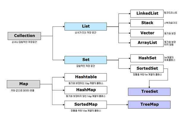 - Map: Collection 인터페이스를 상속받고 있지 않지만 Collection으로 분류됨