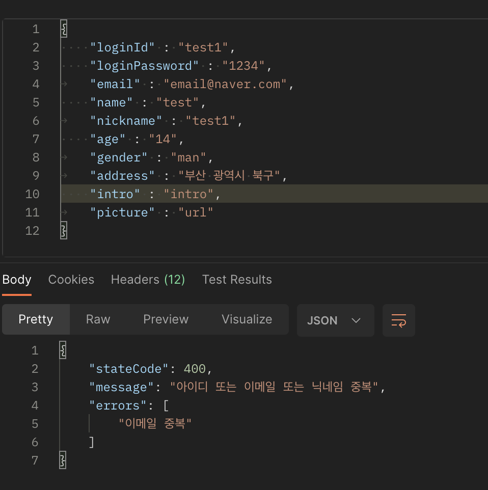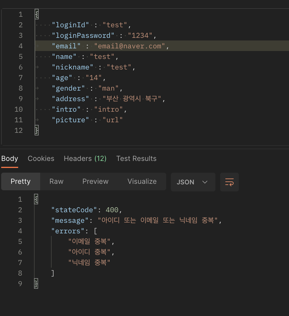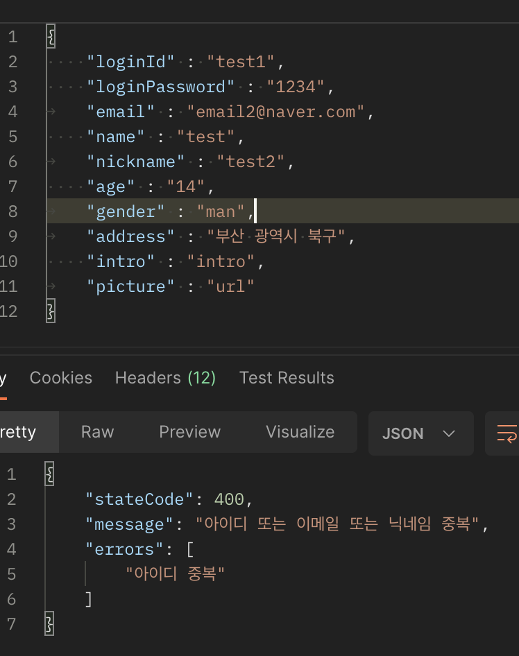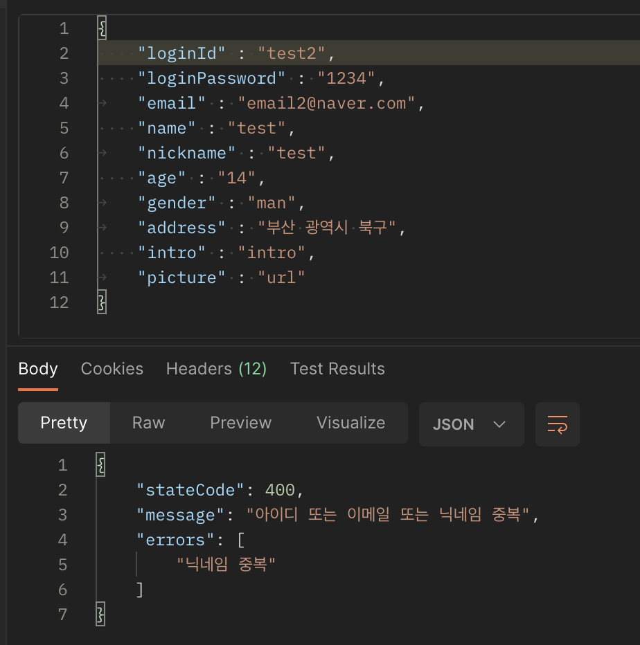 // 중복된 아이디 또는 닉네임 또는 이메일이 있을 때