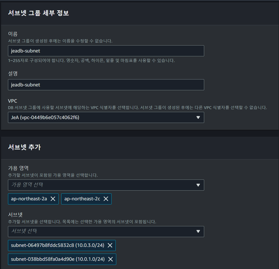 DB 서브넷 그룹을 생성한다. 이때, 서로 다른 2개의 가용영역으로 해야한다.