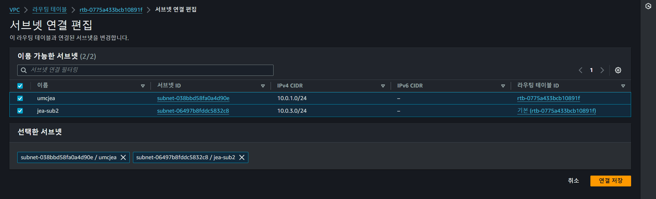 이 서브넷을 퍼블릿 서브넷으로 만들기 위해 외부와 연결이 된 라우팅 테이블에 연결을 해주겠다.