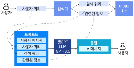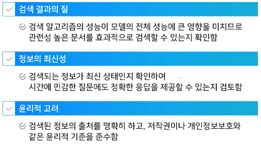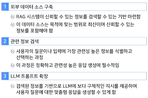 이를 위해 외부 데이터 소스 구축, 관련 정보 검색, LLM 프롬프트 확장 등의 구성요소가 필요하며, 검색 결과의 질, 정보의 최신성, 윤리적 고려 등을 중요시함