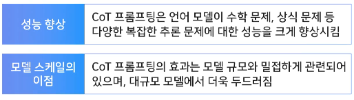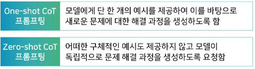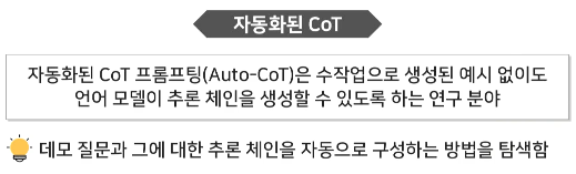 CoT은 one-shot 및 zero-shot 방식으로 작동하며, 자동화된 CoT(Auto-CoT) 연구는 모델이 수작업 없이 추론 체인을 생성할 수 있도록 하는 방법을 탐색함