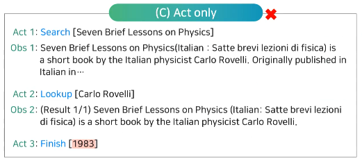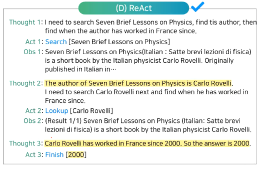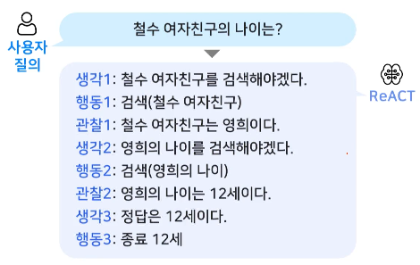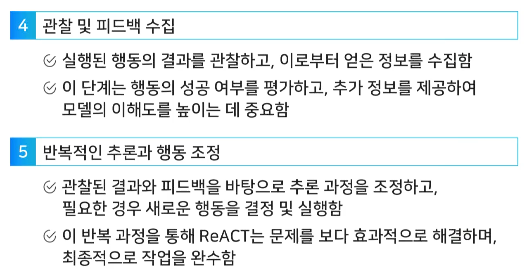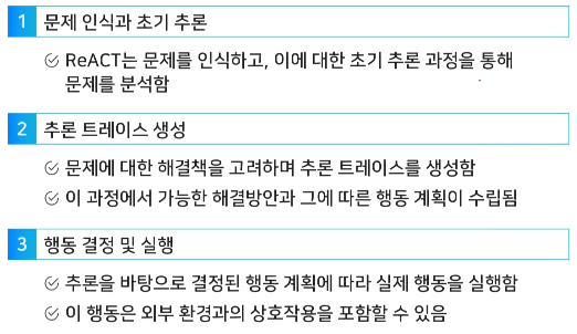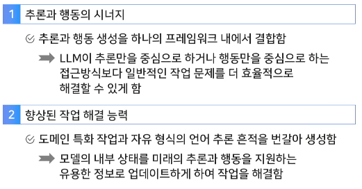 문제 인식, 초기 추론, 추론 트레이스 생성, 행동 결정 및 실행, 관찰 및 피드백 수집, 추론과 행동 조정의 반복적 과정을 통해 문제 해결을 위한 효과적인 상호작용을 수행함