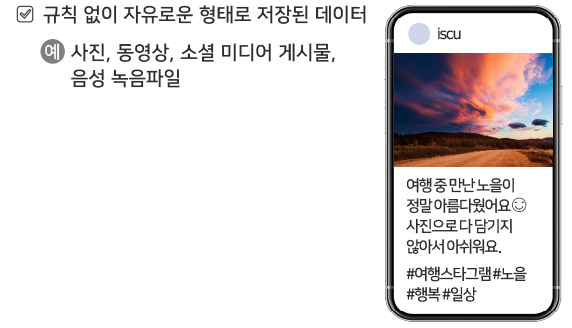 비정형 데이터 : 규칙없이 자유로운 형태로 저장된 데이터