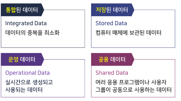 계속적인 변화 : 새로운 데이터의 삽입, 삭제, 갱신을 통해 현재의 정확한 자료를 유지하면서 변화함