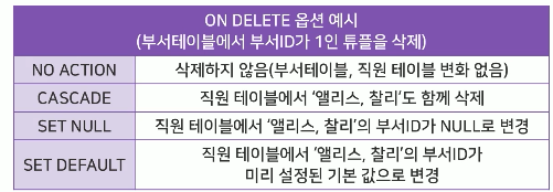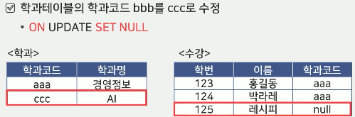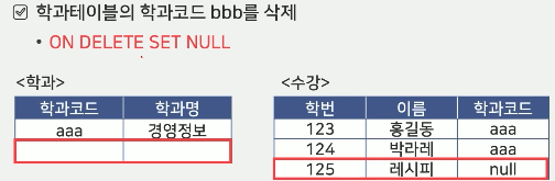 참조되는 튜플이 삭제될 때 관련 튜플의 외래 키 값을 NULL로 변경함