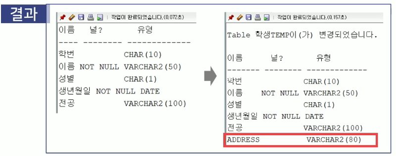 ALTER TABLE 학생TEMP ADD(ADDRESS VARCHAR(80));