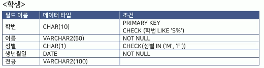 학번 CHAR(10) PRIMARY KEY CHECK (학번 LIKE 'S%"), -- 학번은 반드시 'S'로 시작
