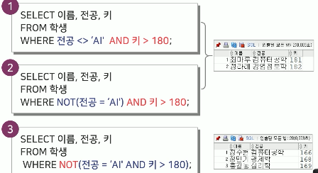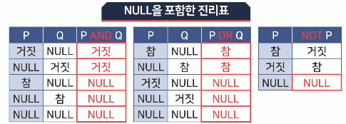 ☑ 하나라도 NULL이면 NULL (참이 보장되지 않음)