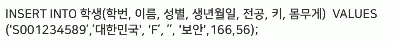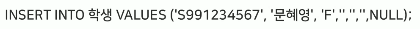 - 빈 값은 NULL 또는 작은따옴표 둘(")로 입력(주의' ' 이 아님)