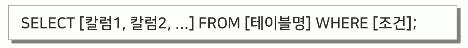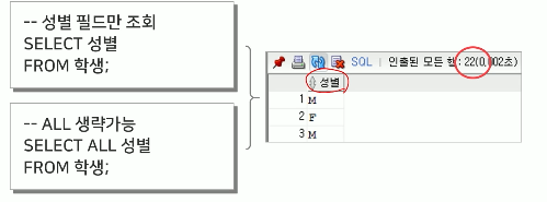 SELECT [ALL/DISTINCT]칼럼1, 칼럼2, ... FROM 테이블명ALL : 중복데이터 모두 출력(DEFAULT)