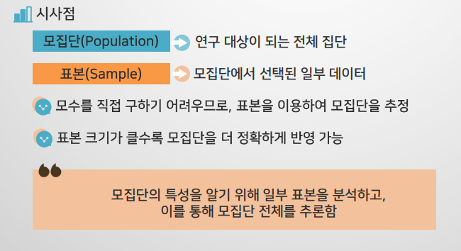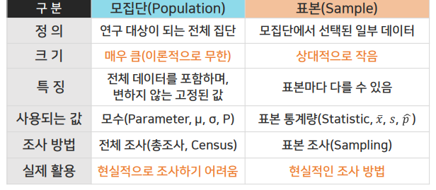 모집단은 일반적으로 분석하기 어렵기 때문에, 표본을 활용하여 모집단의 특성을 추정함