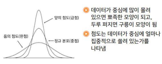 첨도(Kurtosis): 분포가 정규분포보다 얼마나 뾰족하거나 완만한지의 정도를 나타내는 척도