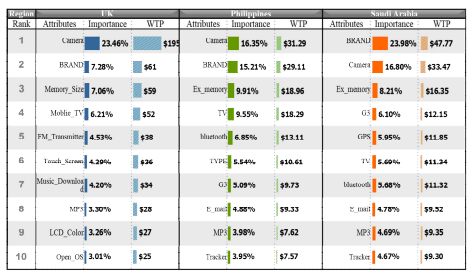 국가별 기능에 대한 중요도 및 지불의향_컨조인트 분석 결과 예시
