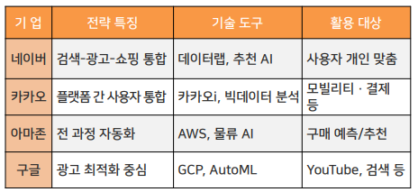 - 고객의 검색, 클릭, 장바구니, 구매 이력은 물론, 물류 이동 정보까지 수집 → 실시간 재고관리, 수요 예측, 자동화 추천 알고리즘 운영