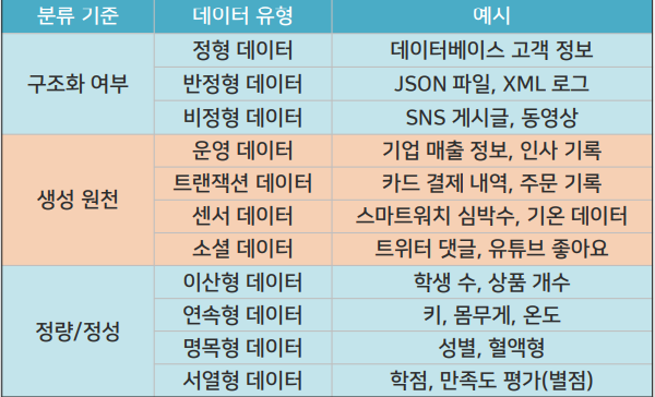 숫자, 문자, 이미지, 영상, 센서 값 등이 있다.