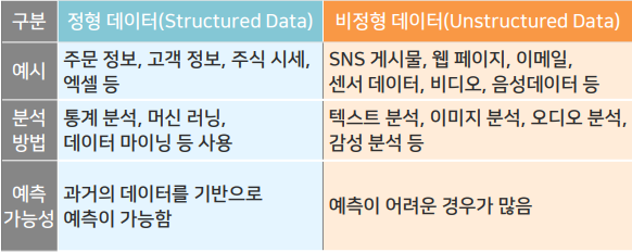 정형데이터는 구성, 정리, 검색 및 분석이 쉬운 반면, 비정형 데이터는 분석이 어려움