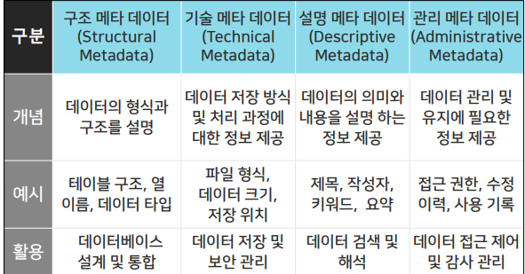 데이터를 설명하는 '정보(정보의 정보)'로, 데이터의 구조, 속성, 출처 등을 정의함