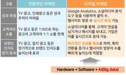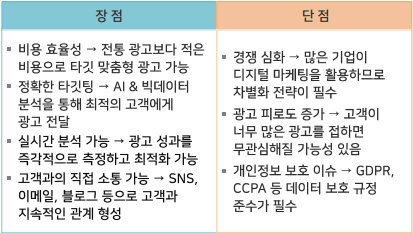 --> 전통적인 TV, 라디오, 신문 광고와 달리, 실시간 데이터 분석과 개인화된 마케팅이 가능하며, 비용 대비 높은 효율성을 제한다는 점에서 현대 마케팅의 핵심이 되고 있음.