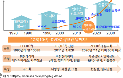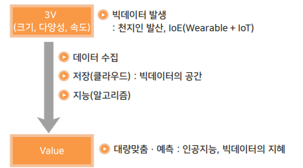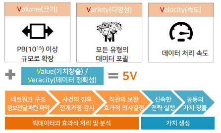 - 3V(Volume, Velocity, Variety) + 2V(Veracity, Value)의 5V 특징을 가짐