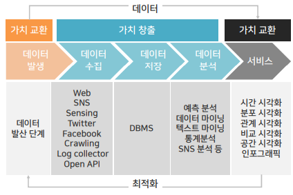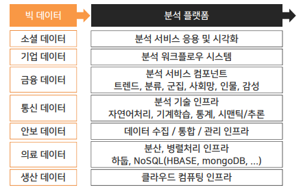 다양한 형태(정형, 비정형)를 띠고 있는 대량의 데이터들을 분석하여 빠른 속도로 가치 있는 정보를 도출하는 기술
