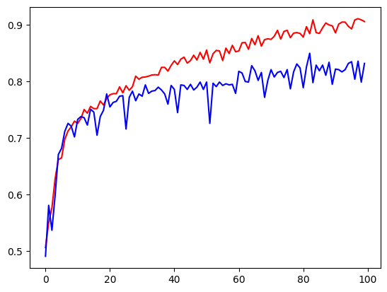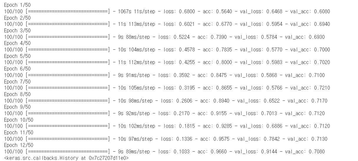 # 100/100 [==============================] - 9s 89ms/step - loss: 0.1033 - acc: 0.9660 - val_loss: 0.9144 - val_acc: 0.7080