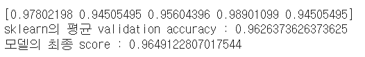 print(f'sklearn의 평균 validation accuracy : {np.mean(score)}')