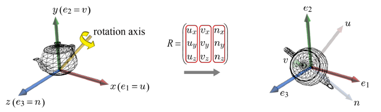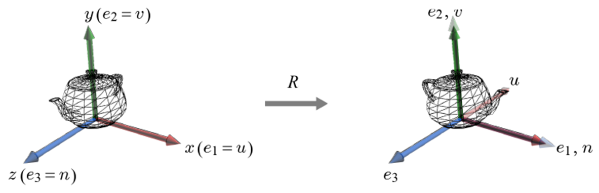 처음 물체가 생성될 때, object space는 world space와 동일한 기저를 가진다. Object Space의 기저를 u,v,n이라 하고, World Space의 기저를 e1,e2,e3이라 할 때, 다음 그림처럼 물체를 회전시키면 World Space에 대해 Object Space의 기저는 회전한다.
