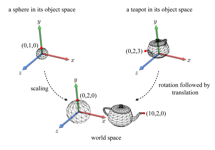 물체가 정의될 때 물체 각각에 대한 좌표계는 Object Space라고 불린다. Object Space와 물체의 관계는 서로 묶여있다고 생각하면 쉽다. 즉, 물체를 움직이는 것이 곧 Object Space를 움직이는 것이다. 그래픽스에서 삼차원 공간의 물체들은 각각의 독립적인 Object Space를 가진다. 그렇기 때문에 하나의 scene에 여러 물체를 위치시키고 변환시키기 위해서는 하나의 통일된 좌표계가 필요하다. 이것이 World Space이다. 물체들은 각자의 world transform을 거쳐 World Space라는 공간상에서 변형된다.