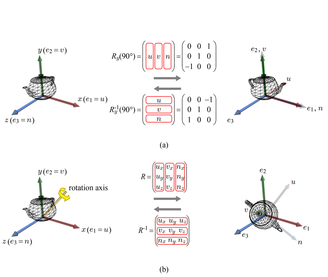 Rotation 행렬은 앞서 살펴봤듯 (u v n) 이고, 이는 orthonormal하다. 따라서 Inverse Rotation은 간단하게 R 행렬의 전치행렬이다: