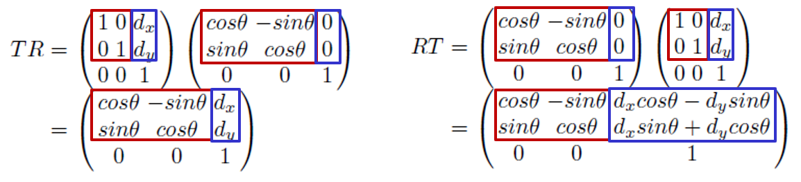 직관적으로 알 수 있는 것 두가지는, 첫째, 계산하기 귀찮아보인다는 것. 둘째, TR과 RT의 결과가 다르다는 것 (이것은 당연하게도, matrix multiplication에서 교환법칙이 성립하지 않기 때문이다). 두 번째 특징은 직관적으로 아래 이미지와 같이 먼저 회전하고 이동하는 것과 먼저 이동하고 회전하는 것이 다르다는 것으로 이해할 수도 있다.
