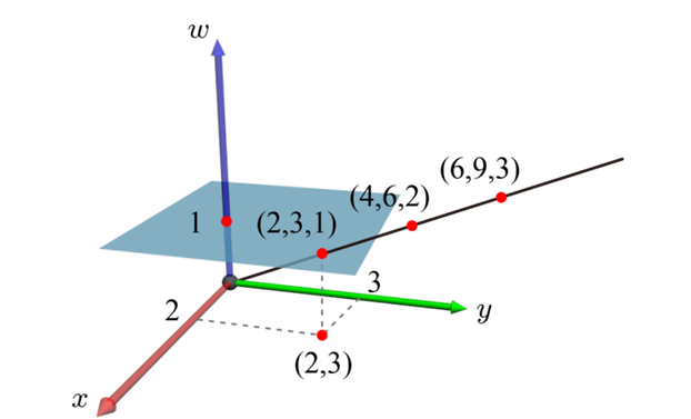 그러나 마지막 요소가 항상 1이어야 하는 것은 아니다. 1을 w로 바꾸어주면, 하나의 cartesian 좌표는 0과 이 좌표를 이어 (wx,wy,w)로 표현되는 직선과 w=1의 교점으로 볼 수 있다. 그리고 0이 아닌 weight w에 의해 하나의 cartesian 좌표로 무한하게 많은 동차 좌표계의 정점을 만들 수 있다.