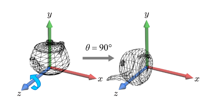 구체적으로, z축을 기준으로 90° 회전이 이루어질 경우, x축은 y축의 위치로 회전한다. 이와 같은 방식으로, x축을 기준으로 90° 회전할 경우 y축이 z축 위치로 이동한다. 마찬가지로, y축을 기준으로 90° 회전하면 z축이 x축 위치로 회전한다. 이러한 관계를 이용하면 Rx, Ry, Rz 회전 행렬을 모두 유도할 수 있다.