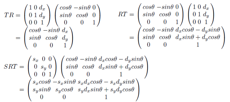 앞서 S,R,T 행렬의 차원을 맞추어 준 이유는 세 transform 사이의 concat을 용이하게 만들어 연속적인 물체의 변환을 표현하기 위함이었다. 그러나 여전히 반복되는 transform의 계산은 쉬운 편이 아니다. 다음 이미지는 RT, TR, SRT의 concat 결과를 보여준다.