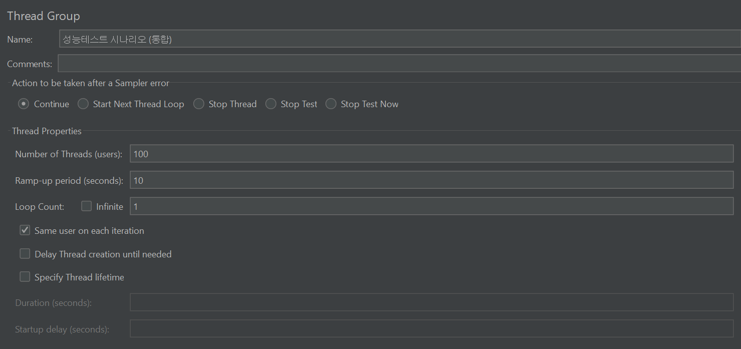 예를 들어 100명 / 10초로 설정했을 경우, 초당 10명을 추가하여 부하를 준다.