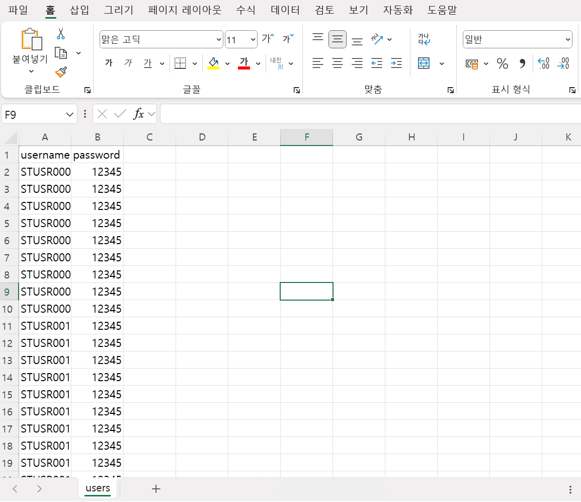 Excel에서 유저의 아이디와 비밀번호를 입력하고 csv 파일로 저장한다.