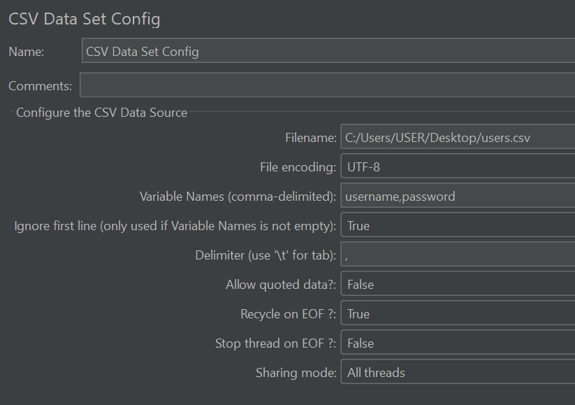 👉 Test Plan - Add - Config Element - CSV Data Set Config
