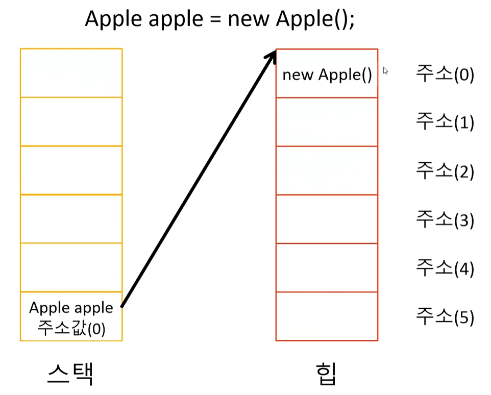 이 사진을 보면 스택에는 클래스 인스턴스와 주소값이 들어있고 힙에는 new 클래스가 들어있다. 간략하게 설명하면 우리가 선언한 부분은 스택으로 가고 메모리는 힙으로 간다. 위 사진은 참조형태라고 하는데 만약 int num = 0;이라고 했을 경우에는 스택에 주소값 부분에 0이 같이 들어간다. 하지만 클래스 자체는 값형태가 아니고 참조 형태라 할당해주는 new Apple()부분은 힙의 주소로 들어가고 선언자체는 스택에 들어가서 힙의 주소를 부르는 형태로 사용하게 된다.