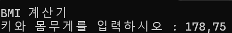 위에서 코드로 (',')라고 해두었기 때문에 178과 75가 서로 같은 값에 저장되는 것이 아니라 하나는 input[0]에 하나는 input[1]에 저장해서 따로 입력할 필요없이 같은 줄에 여러개를 입력할 수 있었다. 그러고보니 어떤 사이트에서 개인정보나 그런거 적을 때 스페이스바로 뛰어서 적거나 ,로 연속으로 적으라고 했던걸 봤었는데 아마 이런식으로 코드가 짜여졌던 것 같다.